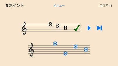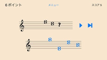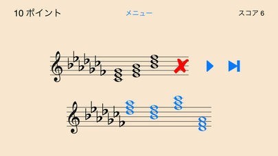 App Storeより引用どの和音を弾いているかによって決められるインターバル・音楽スキルに挑戦してみましょう。 それぞれのパズルに、3つの和音が音声と共に奏でられ、その内の初めの2音が表示されます。 3つ目の和音については、4つの選択肢が表示されます。其々のゲームにおいて、あなたの答えが正しいとスコアに加算されますが、誤りがあると半ポイントが差し引かれます。何回でもお好きな限り3和音を奏でることができ、応えなくても特にペナルティー無しに次のパズルに進むことができます。