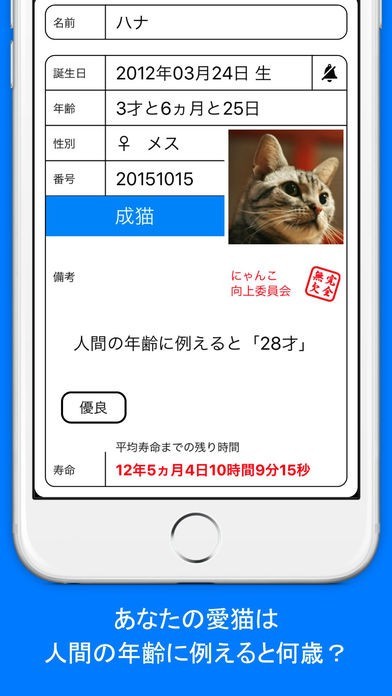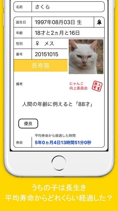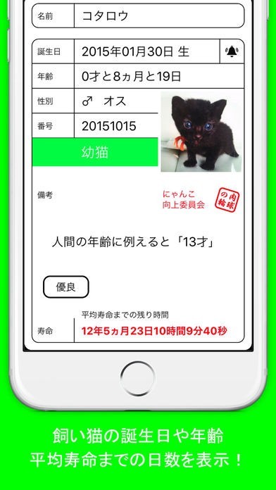 1度ネコの情報を登録しておけば、名前をタップするだけで、そのニャンコの情報(誕生日、年齢、平均寿命までの日数、平均寿命から経過した日数、人間の年齢に例えると何歳)が表示されます。もちろん、多頭飼い・複数飼いにも対応。