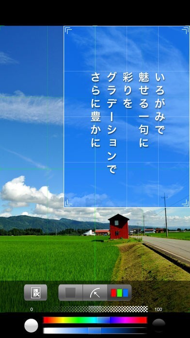 書体にはヒラギノゴシックと明朝体、はんなり明朝、美しい明朝などの、日本語を美しく表現してくれる書体が6書体収録されています。文字の色や大きさ、行間も調整が可能なので、思い通りの作品を作ることができます。色紙は透明度や色が自由に設定でき、グラデーショも利用できるので、写真に映える文字を入れることができます。