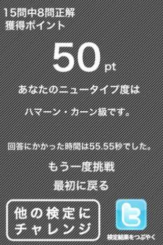 検定クイズを15問行った後はあなたの「ニュータイプMS戦士度」が診断されます。