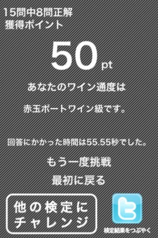 検定クイズを15問行った後はあなたの「ワイン度」が診断されます。