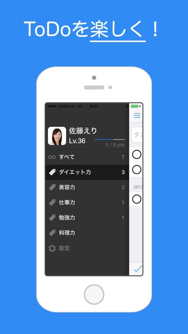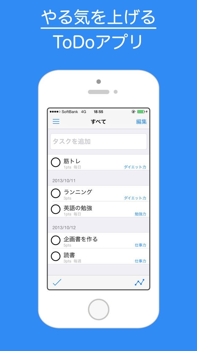 普通のToDoアプリではどうしても続かないという人におすすめです。 タスクを入力して実行するとレベルアップと表示され、サウンドがなるなどゲーム間隔で楽しく使用することができます。