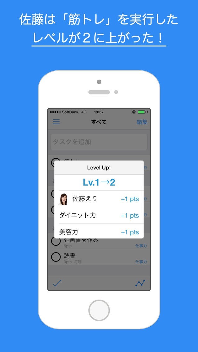 ダイエットのためのランニングや筋トレは面倒くさくて続かないことが多いと思います。設定したタスクにはポイントが付き、どれくらい実行したかをゲームのステータス画面のように確認できます。