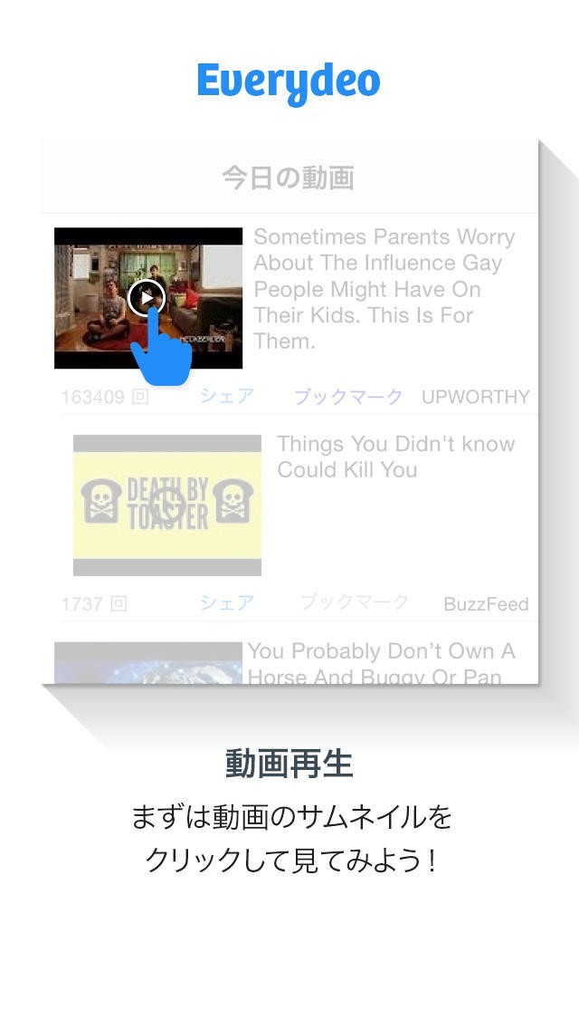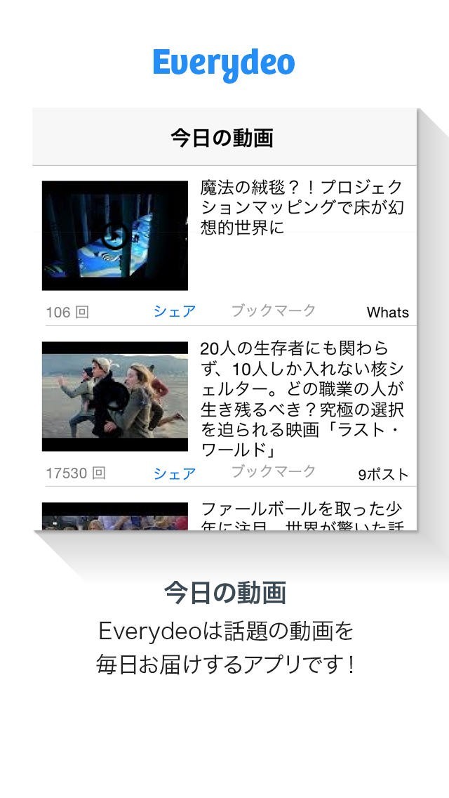 Everydeo (エブリデオ) はソーシャルメディアで話題の動画 (Video) を毎日 (Everyday) 見られる無料アプリです!毎日新しい動画を日替わりでお届けします。気に入った動画をブックマーク (お気に入りに登録) したり、昔話題になった動画を検索したりもできます!!
