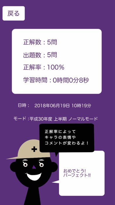 出題数を5問から全問まで選択できるのでスキマ時間に合わせた学習が可能です。通勤・通学時間はもちろん、テレビのコマーシャル中にも活用できます。全問正解するとキャラが祝福してくれます。