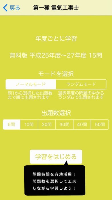 ランダムモードも選択できるので、実力を試したい時に使えます。また問題数も5問から50問まで、自分で出題問題数を選択できるので、空き時間に合わせて選ぶことができます。