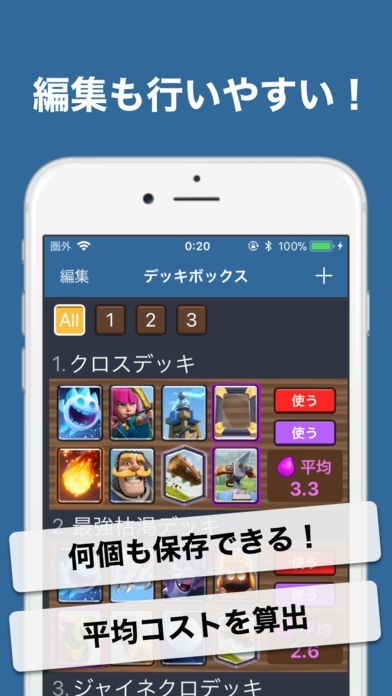ゲームのクラッシュロワイヤルではデッキが5つまでしか保存できず、色々とカードを入れ換えているうちに強かったデッキの組み合わせが分からなくなってしまうこともしばしば。デッキを何個でも保存でき、デッキの名前も変更出来るからデッキ管理に最適