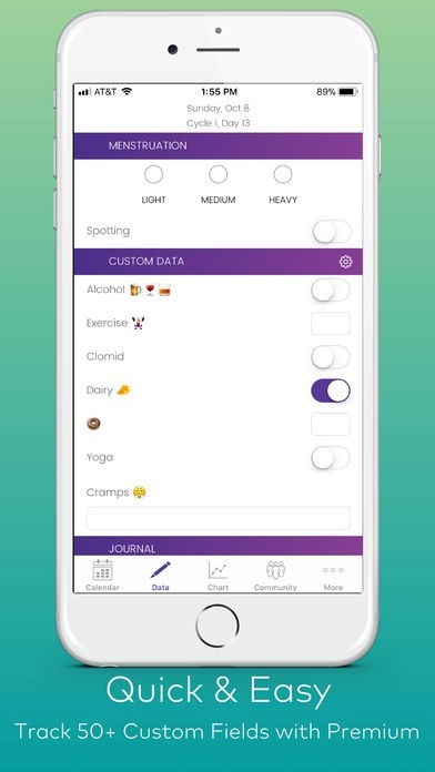 + Use Kindara Charts for customized input such as: intercourse/insemination, ovulation predictor kit results, cervical changes, PMS symptoms, spotting, pregnancy tests, alternative birth control used, cervix height/firmness and more