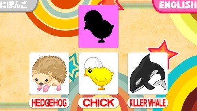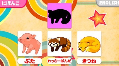 表示されたシルエットの動物の名前を当てるゲームで、正解をタップすると動物の名前が日本語や英語で発声される仕様が魅力