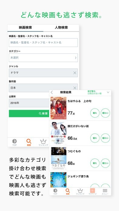 キネマ旬報が運営するアプリで、9万もの映画作品から様々な角度で映画作品が検索できる