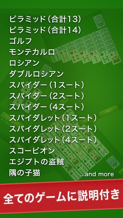 「ソリティア -KING-」は、20種類以上のソリティアゲームを詰め込んだトランプゲームアプリです。iPhoneの画面をドラッグしたりタップすることでトランプを自由に操作することができます。たくさんのルールがあるソリティアですがすべてに遊び方の説明が用意されているので楽しくプレイできます。新しいルールのゲームが毎月追加されるのも魅力的なポイントです。エジプトの盗賊やスコーピオンなどここでしか遊べないルールにもこだわっています。