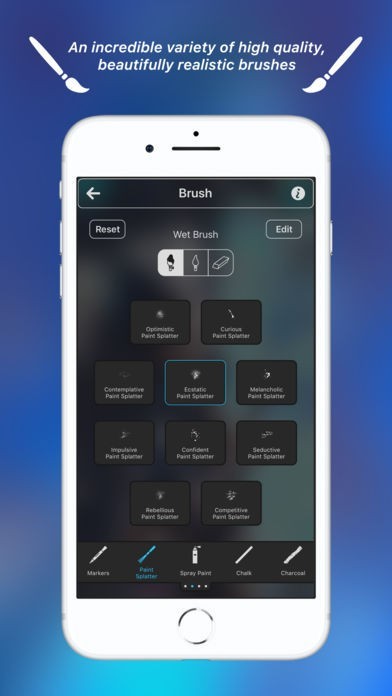 ブラシの豊富さもこのアプリの特徴の1つです。150種類以上のデフォルトブラシが用意されており、それぞれウェットブラシ・ドライブブラシの他、消しゴムとしても利用できます。