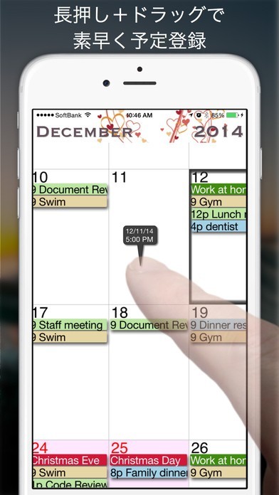 予定の登録は、画面を長押しで。そのままドラッグすることで時間指定も簡単にできます。
