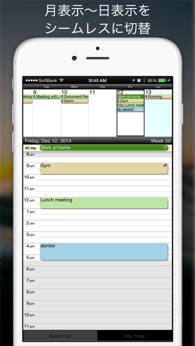 月単位の予定から、日単位の予定、個々予定の詳細情報へと、ワンタップでシームレスに切り替わります。