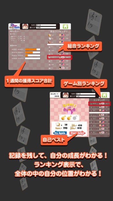 日本だけでなく、世界中でアプリを使用しているユーザー同士で、自己ベストを競い合ったり、週ごとの獲得した得点によってランクづけされるので、成長を身近に実感できます。