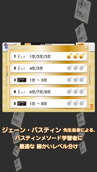トレーニングのメニューは難易度が複数用意されているので、ユーザーによって段階的な読譜学習を行えます。クリアしたメニューはマークがつくため未挑戦のものを効率的にチャレンジできます。
