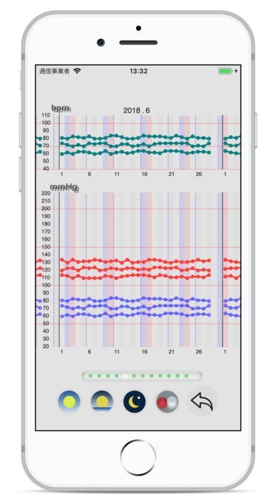 最高血圧と最低血圧から算出された平均血圧は折れ線グラフで表示されます。血圧の変動が大きすぎないか、時間帯によってどのように推移しているのかがひと目で分かります。自分の血圧状態をきっちりと把握できます。