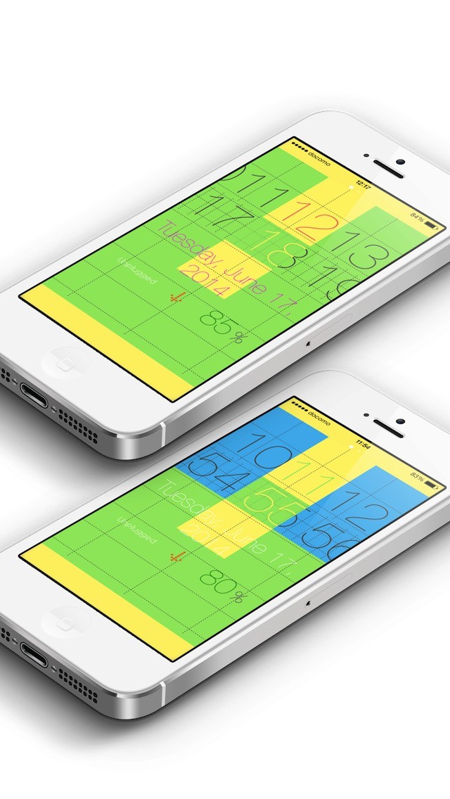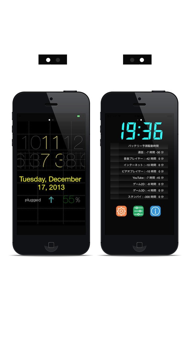 "ScrollClock"は、時間を刻む数字が横にスクロールし流れていく新感覚の時計アプリとなっています。時間と秒数が横にスクロールする仕様になっており、変化する文字のグラフィック演出が魅力です。シンプルな機能ながら、背景色を白、黒、赤、黄、緑、青の6色から選べるなど、カスタマイズ要素も備えています。また、画面をフリックすると、バッテリー残量を確認できる画面に切り替わり、%による残量表示に加えて、通話や動画視聴など、バッテリー残量で可能な駆動時間をアクション毎に知らせてくれる機能を搭載しています。このように、時刻が横にスクロールするユニークな時計が魅力で、ついつい充電が心配になると言った方にも最適な仕様となっています。