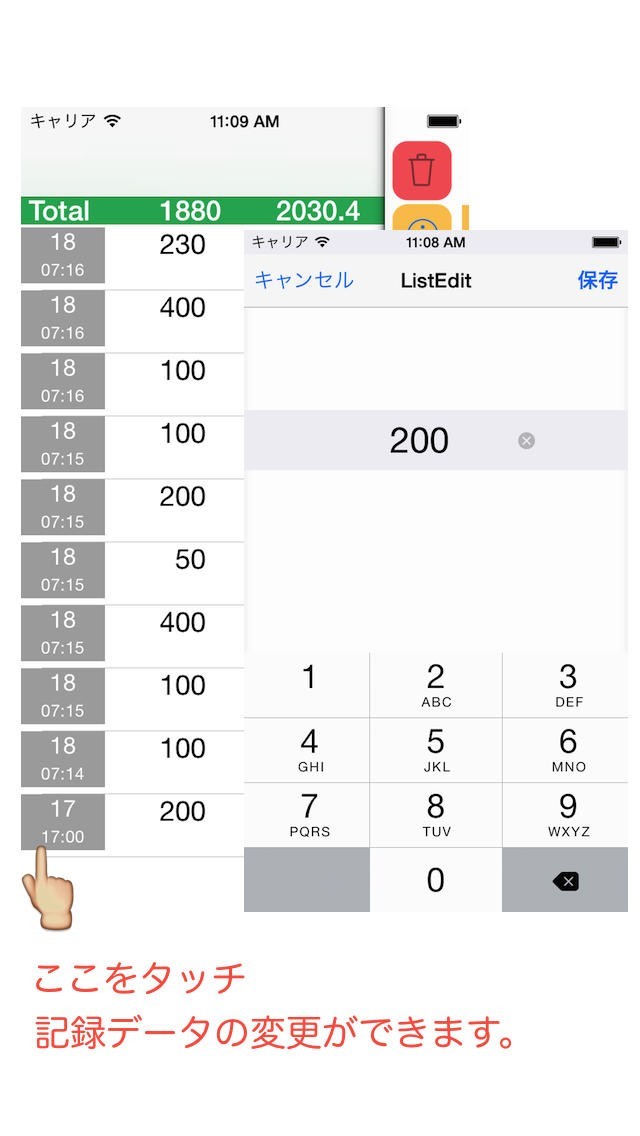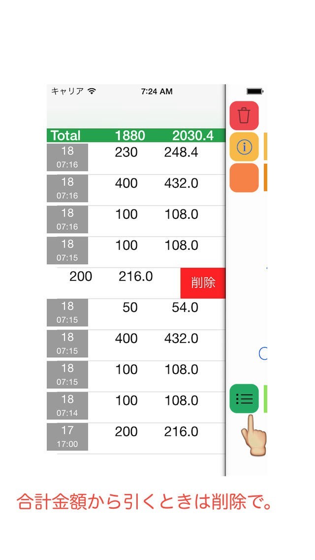 リスト表示機能があり、登録した値段は緑ボタンを押すとリスト表示が出てきます。編集したいときは日付をタップで編集メニューへ移動できます。ややこしい金額の時も、すぐに税込金額がわかるので安心です。