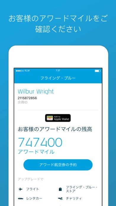 搭乗券を購入するときに使えるアワードマイルの確認がアプリで可能。搭乗券や席のアップグレードなどオランダ航空をお得に便利に利用できるマイルをためることができます。