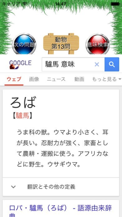 意味が分からない時に、連動する検索サイトから意味を検索することができます。キーワードを入力し、意味を理解して漢字の読みと一緒に意味も覚えましょう。意味を覚えることで超難読漢字の読みが頭にしっかり入ります。