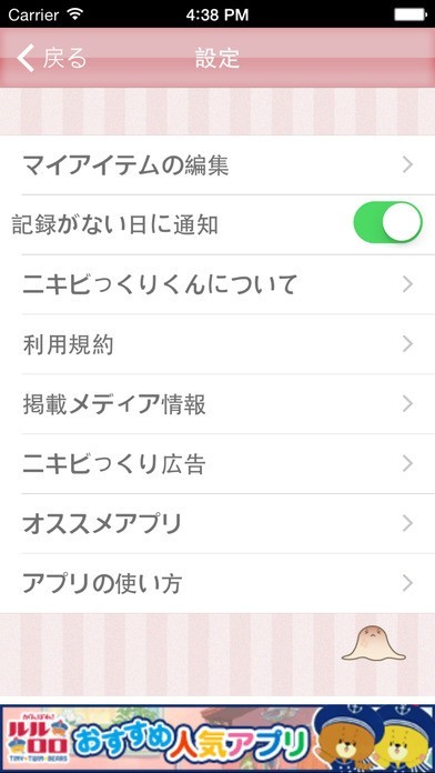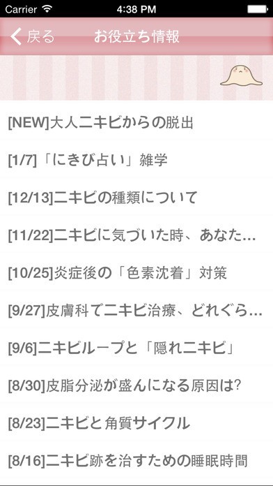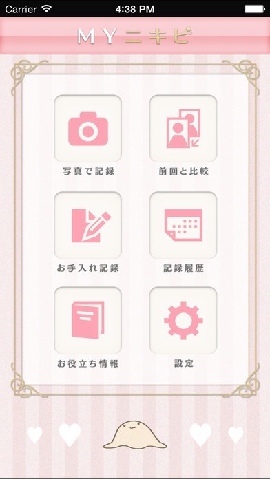ニキビの悩みを一括管理してくれる便利なアプリ「MYニキビ」 まずは写真で記録機能を使って、自分のニキビを撮影してみましょう。 できた日や個数、お肌の状態などもコメントしておけば、管理や治療に役立てることができます。 便利なお手入れ記録機能も搭載しており、使用した薬や使用量について残せるのも嬉しいポイント。 さらにお肌のためのお役立ち情報もたっぷり掲載。 種類や管理方法、角質サイクルについての情報などを、一覧から選んで手軽に読めるようになっています。