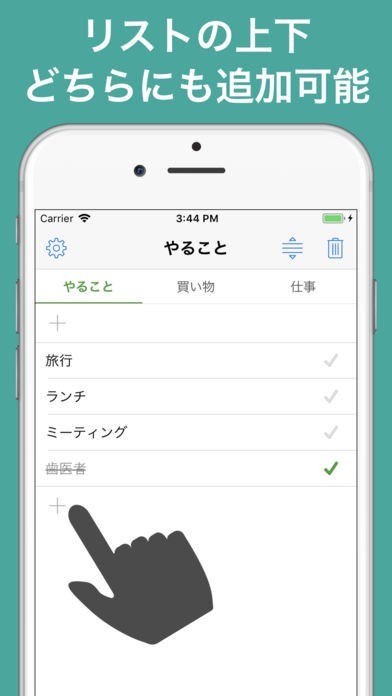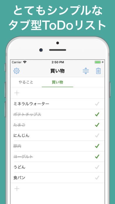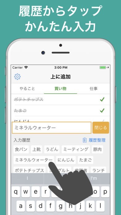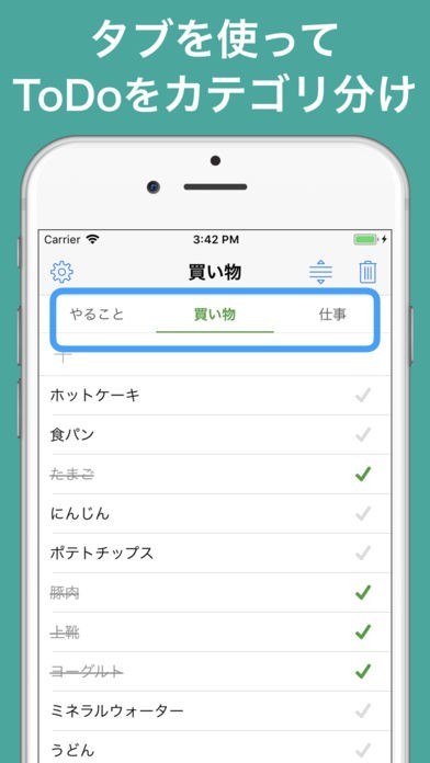 ・タブ(「買い物」、「仕事」など)を使って、ToDoをカテゴリ分け