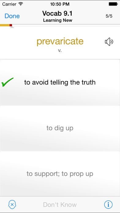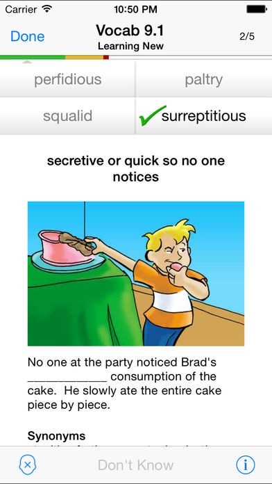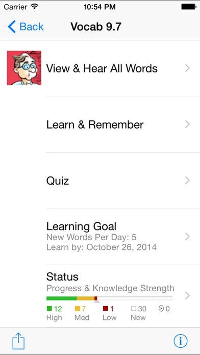 - Spaced Repetition: A scientifically proven method for optimal memory retention. The app keeps track of how well you've learned a word, and presents challenging words more frequently than others. It even suggests a time when you should drill again before you forget the words.