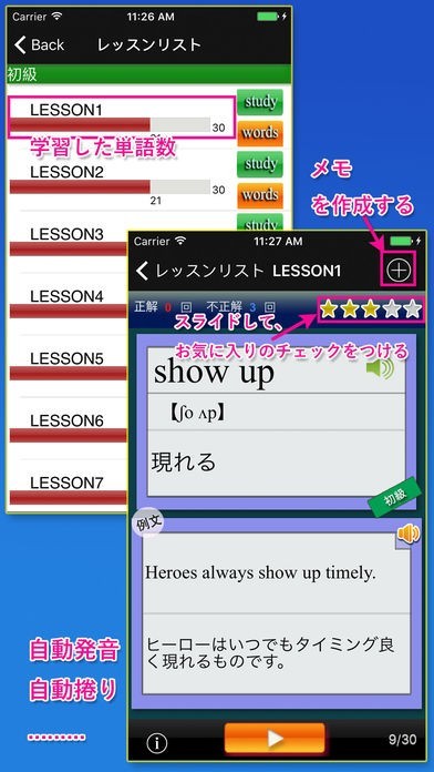 ・単語学習の進捗が覚えられますので、次回入ったら、学習を続けられます。