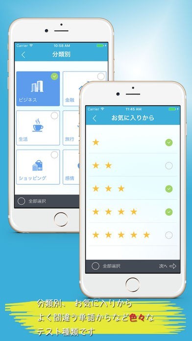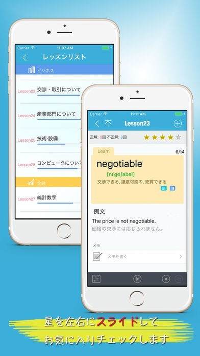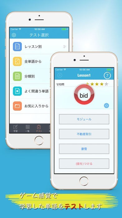 英語能力テストTOEICのスコアアップを目指したい時に便利なのがこのアプリです。 TOEICに良く出てくる単語と熟語がたくさん揃っており、十分なTOEIC対策が期待できます。 生活や旅行、ビジネスなど6種類に分類されており、シーンに合ったものを覚えることが可能です。 テストと復習機能が付いており、苦手分野を克服したい時にも便利です。 チャート表示機能もあり、テスト結果や正解率などが分かりやすくなります。 参考書では中々覚えられないという方にも使えるアプリに仕上がっています。