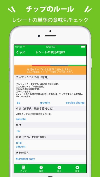 「チップ計算電卓アプリ - チチププ 無料」は、チップの額を計算することができるだけでなく、支払総額を知ることができたり、日本円でだいたいいくら払ったかを確認することも出来るアプリです。「チップ計算電卓アプリ - チチププ 無料」は、オフラインでも問題なく利用することが出来ます。それだけではなく、「チップ計算電卓アプリ - チチププ 無料」は、音声読み上げ機能がついており、英語でコミュニケーション取れない人の助けにもなります。