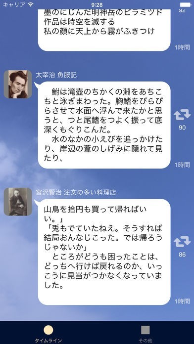App Storeより引用▼160人の文豪が、自分の作品をまるまる一冊、不定期につぶやきます。
