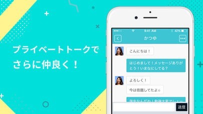 プライベートトーク機能を搭載しています。気の合うユーザーはプライベートトークに誘って、2人だけでのんびりおしゃべりが可能。仲良しのユーザーと盛り上がって、さらに仲良くなることができます。