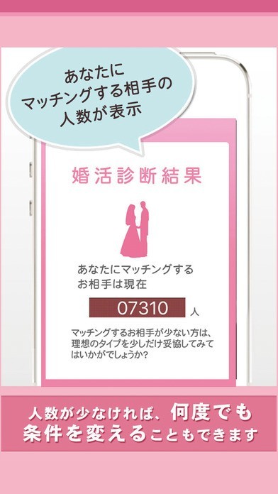 結婚相談所であるサンマリエのノウハウが凝縮されており、約2分ほどの簡単な質問に答えるだけで、結婚情報業界からその条件にマッチした人の割合がどれくらいいるか知ることができます。必要あれば、相手のプロフィールを頂くこともできるので婚活をしている方にはぴったりです。自分の理想の異性のタイプや結婚観も分かるので、相手を選ぶ上で役立ちます。アプリ内に名前は表示されず、プライバシーもしっかり保護してくれているので安心して利用できます。