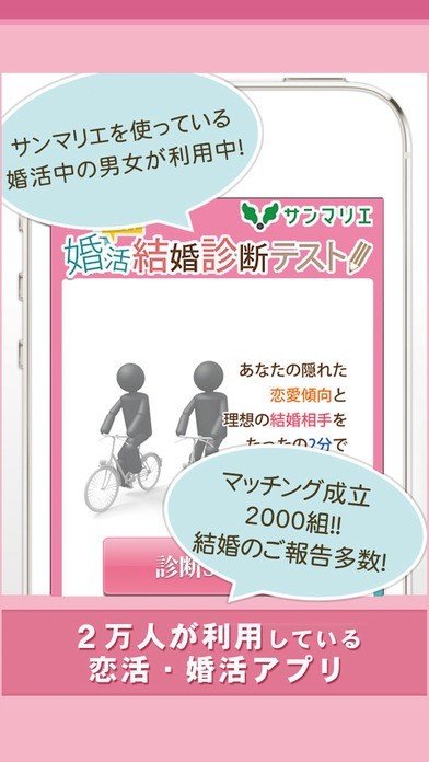 結婚相談所“サンマリエ”が運営する結婚診断アプリです。 そろそろ結婚を意識し始めてはいるものの、まだ恋愛もしたい。そんな悩みを抱えるオーバー25才に向け、理想の相手探しをサポートしてくれます。診断はいたってシンプルで、性格や好み、抱いている結婚観や生活スタイルなどの簡単な質問にYES・NOで答えていくだけ。約2分で理想の相手を探してくれます。結果が出たら、業界トップクラスのサンマリエ会員の中から、チェック結果にマッチした相手の人数を算出。さらに、それらのお相手のプロフィールをもらう事も可能。その際は、もちろん名前は非公開です。そこから、婚活をスタートさせてはいかがでしょう。