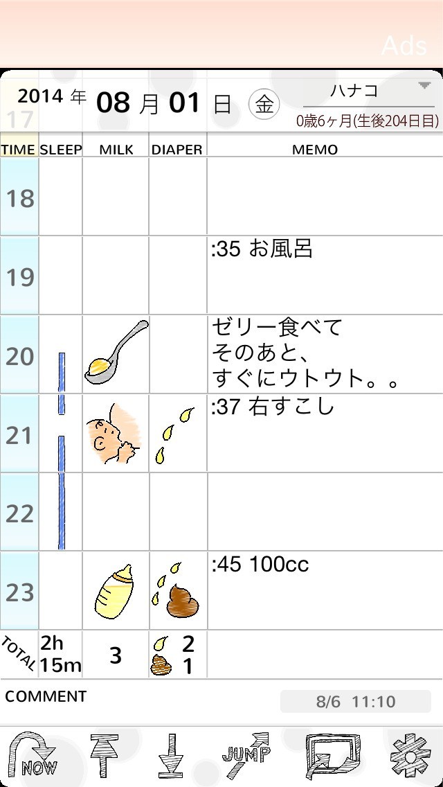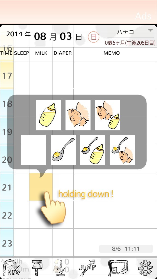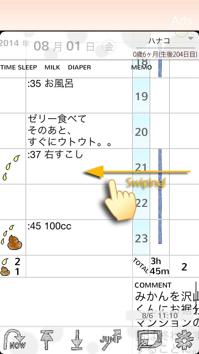 睡眠時間、食事(ミルク)、ウンチやおしっこなどのイベントを簡単な操作で記録することができます。