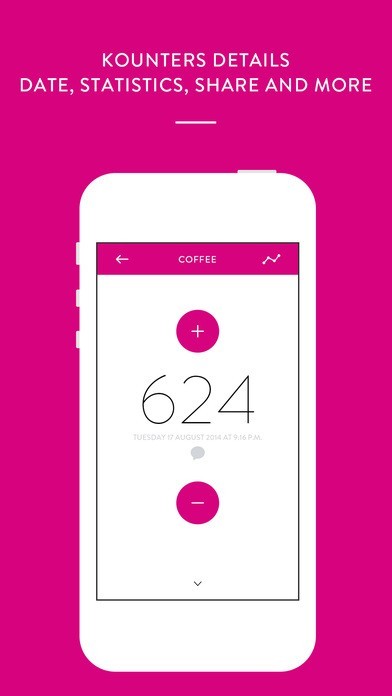 With Kount.ly you are going to be able to count anything and everything. You want : the number of coffees you had, the number of professional meetings, of books you have read. Add a comment to each Kount you make, follow their progression on a chart and share it with your favorite social networks.