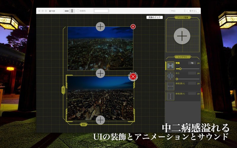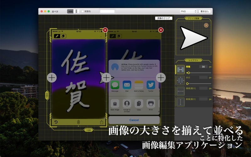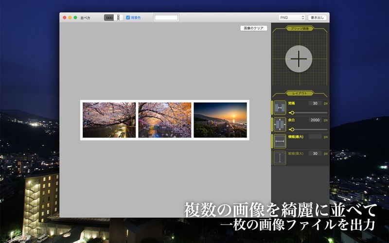 App Storeより引用複数の画像の大きさを揃えて、等間隔に並べて一枚画像として出力するソフトです。