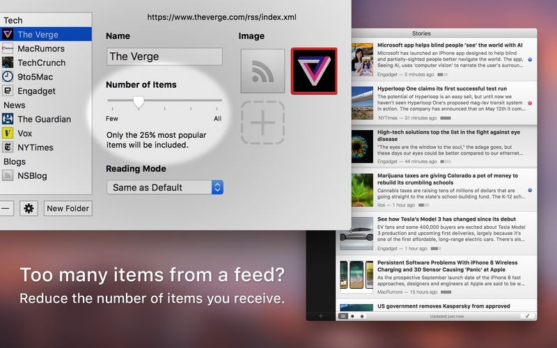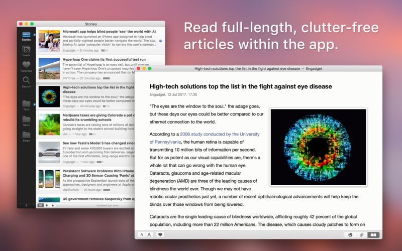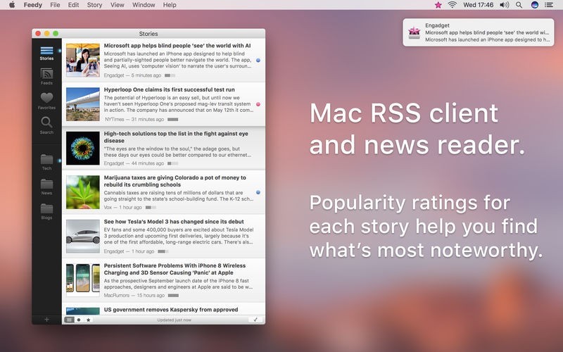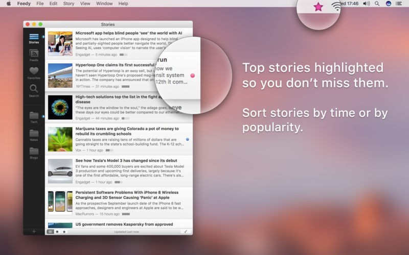 - Top stories highlighted in the list and menu bar so you don't miss them