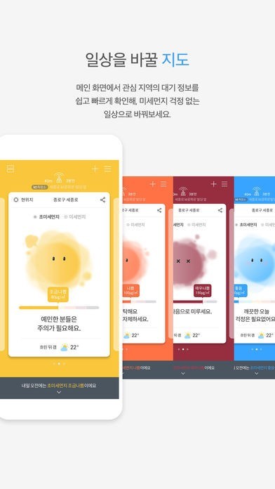 -미세먼지/초미세먼지의 상태 및 수치를 색상과 캐릭터로 활용하여 시각화로 직관적인 현황 데이터를 제공합니다.