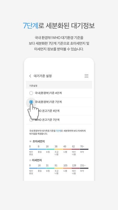 400여개의 국가측정소와 2,000여개 KT측정소의 전국 총 2,400여개 측정소에서 측정한 촘촘한 정보를 '환경부 기준/WHO 기준' 4단계와 이를 기준으로 7단계로 세분화한 자체 기준을 제공하여 미세먼지에 민감한 사용자들도 정확하고 촘촘한 정보를 확인 할 수 있습니다.