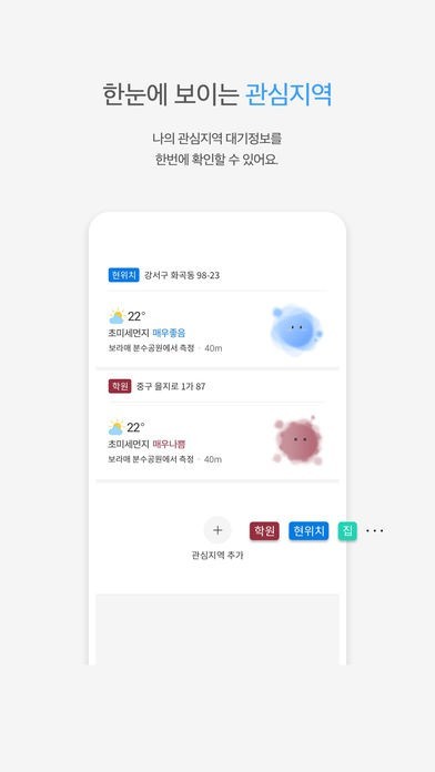 -관심지역을 등록/관리하여 관심지역별 대기정보, 날씨정보, 생활가이드 등의 대기질 정보를 제공합니다.
