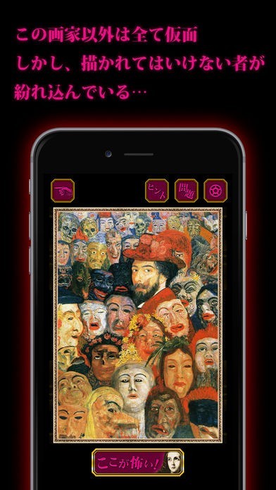 有名画家たちの人気絵画の中に隠された本当の意味や恐怖を探し当てるゲームです。一見普通に見える絵画に、人には話せない怖いエピソードが秘められています。一風変わったホラーを味わってみましょう。
