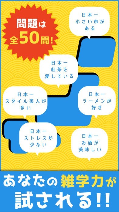 出題される問題は全50問あり、様々なジャンルのものが揃っています。例えば、日本一お酒が美味しい、スタイル美人が多い、紅茶を愛しているなどといったものがあります。様々な雑学を身に付けることで、雑談の幅が広がることが期待できます。
