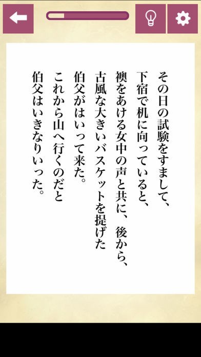 例えば夏目漱石の「我輩は猫である」の一文に一文字だけ誤字があります。それを制限時間内に見つけ出してタップすると答えることができます。読んだことがある人は違和感を見つけ出すという新しい楽しみ方ができますよ。