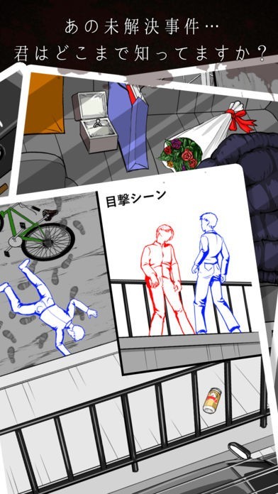 過去に本当にあった未解決事件が収録されており、まるで捜査しているかの様な感覚で知る事が出来ます。事件の概要が説明された後に、警察の見解とは矛盾している点を探す様な質問がされます。それを当時の事件現場再現イラストから見つけ出し、選択して進めていきます。ミステリーが好きな方や、未解決事件に興味のある方にはたまらない作りになっています。
