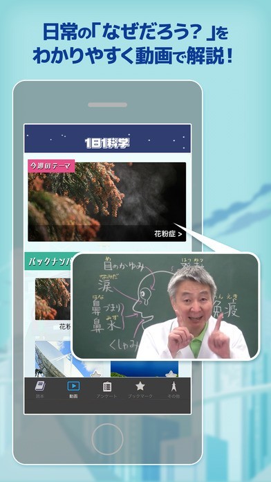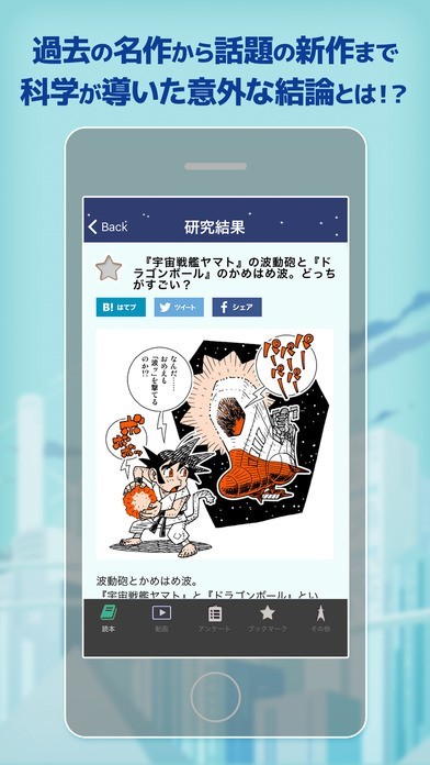 「空想科学読本 アプリ版」では、毎日無料で科学に関連する楽しい記事を届けてくれます。 記事はオリジナルで他では読むことが出来ないので特別感があります。 また、アプリでは動画を使った楽しい科学の解説をしてくれているので、文字を読むのが苦手なお子さんでも興味を持ってくれる可能性が高いです。 さらには、アプリのオリジナル機能としてはアンケートを行っていて、投票で人気があったテーマを実際に扱ってくれます。 また、興味深かったものがあればブックマークであとで確認することだってできます。