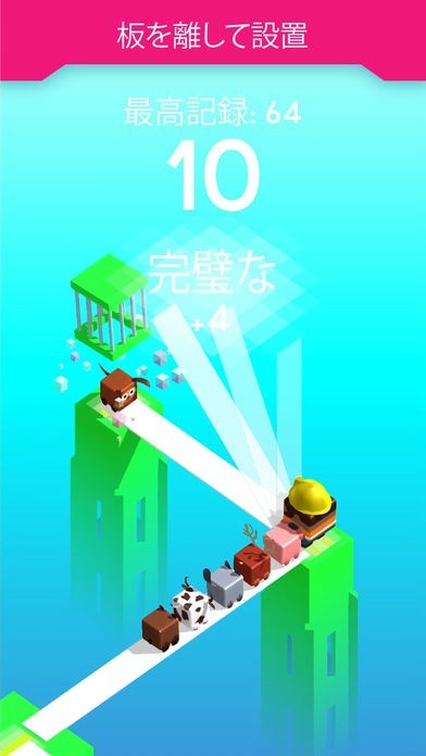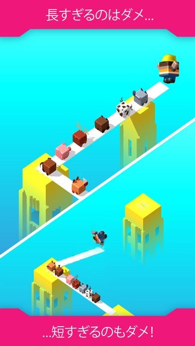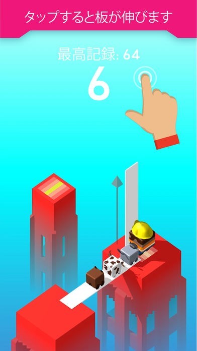 可愛いキャラクターたちをひたすら橋となる板の上を歩かせていくゲームです。 板の長さはタップする指の押し時間によって決まり、長すぎても短すぎてもキャラクターが落ちてしまいます。 進めていくにつれて獲得アイテムや、連れて行く可愛いキャラクターが増えていきます。 コツをつかむことができれば、歩くコースの難易度が上がっていきハイスコアが狙えます。