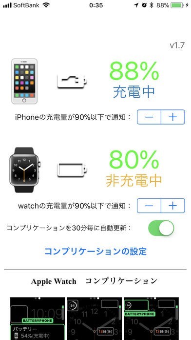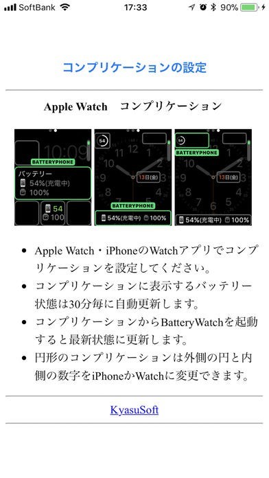 ・コンプリケーションに表示するバッテリー状態は約30分毎に自動更新します。