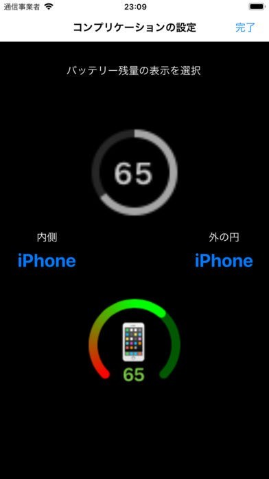 ・円形のコンプリケーションは外側の円と内側の数字にそれぞれiPhoneとWatchのバッテリー残量表示を割り当てられます。